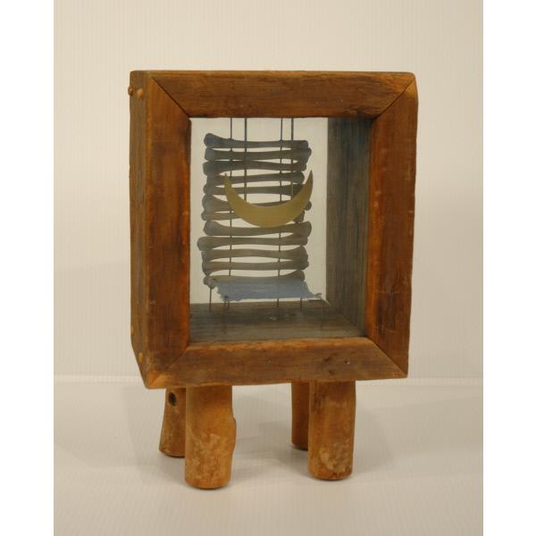 DescriptionAn abstract sculpture composed of a crescent shape suspended over a pattern of horizontal lines and above a horizontal, blue plane. These shapes are set into a deep wood frame balancing on two circular legs. abstract, shapes, crescent, rectangle, plane, lines, horizontal, repetition, pattern, frame, legs