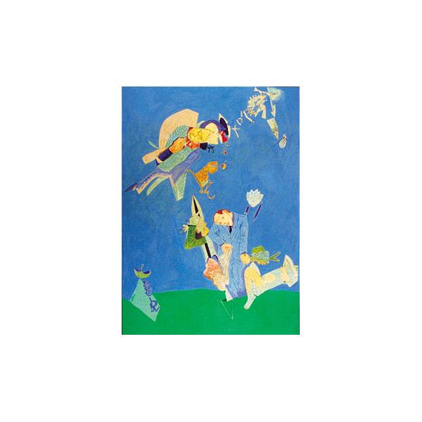 DescriptionA figurative painting depicting figures and abstract shapes in a simplified landscape. One male figure flies through the air while another in a suit stands on the ground beside a reclining female nude. figurative, figures, male, female, nude, landscape, stylization, abstract, shapes