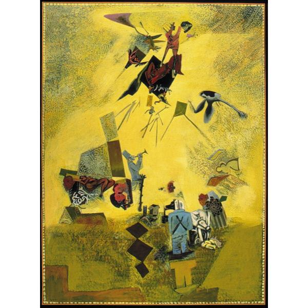 DescriptionA figurative painting depicting male and female figures, clothed and nude, in an abstract space with stylized forms and shapes. figurative, figures, male, female, nude, abstract, stylization, shapes