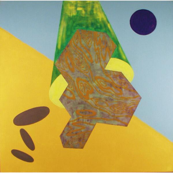 DescriptionAn abstract painting divided in half by a diagonal line reaching from the upper left to bottom right corners of the canvas, overlapped by patterned irregular shapes, circles and ovals. abstract, sections, line, diagonal, shapes, irregular, circles, ovals, repetition, pattern
