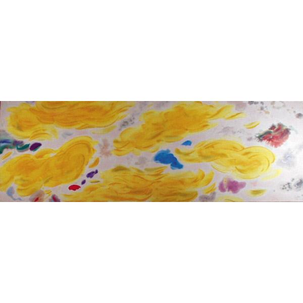 DescriptionAn abstract painting featuring fluid yellow shapes composed of gestural brush strokes against a white background that is accentuated with shapes in red and blue. abstract, shapes, fluid, gesture, brush strokes, layers