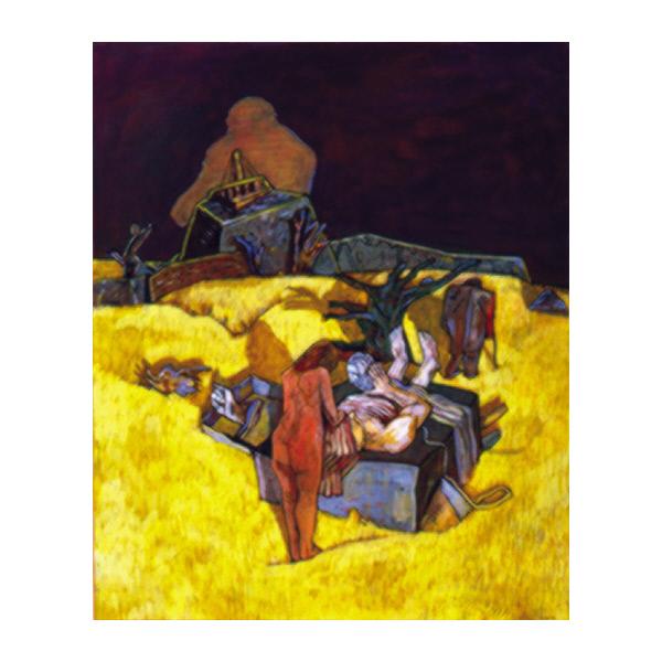 DescriptionA figurative painting depicting a nude man lying on a table in a field of grass, while a nude woman stands over him. A building in visible in the background. figurative, figures, male, female, nude, furniture, table, landscape, architecture, building, vegetation, grass, trees