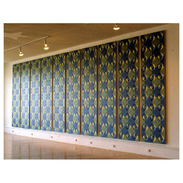 DescriptionAn abstract painting consisting of ten canvasses of equal size that a repeating checkered pattern with overlaid circles stretches across. abstract, multi-panel, repetition, pattern, checkers, shapes, circles